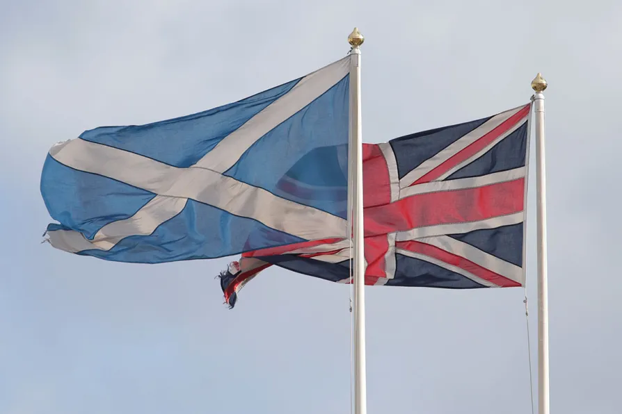 A Saltire flag and a Union flag flying above Whitehall in Westminster, London
