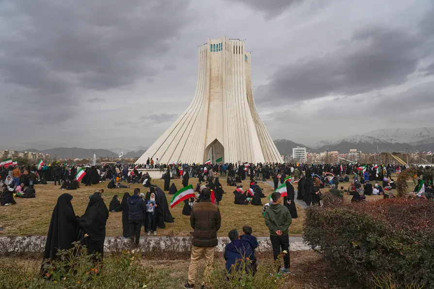 People attend an annual rally marking 1979 Islamic Revolution as they gather around the Azadi (Freedom) monument tower in Tehran, Iran, February 11, 2026