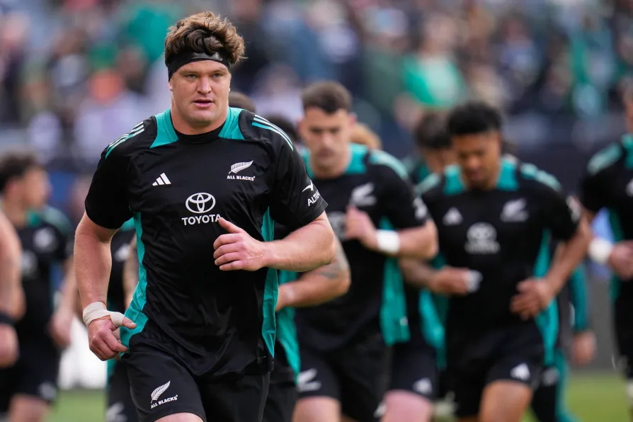 New Zealand's Scott Barrett warms up with his teammates ahead off the rugby international between the All Blacks and Ireland in Chicago, November 1, 2025