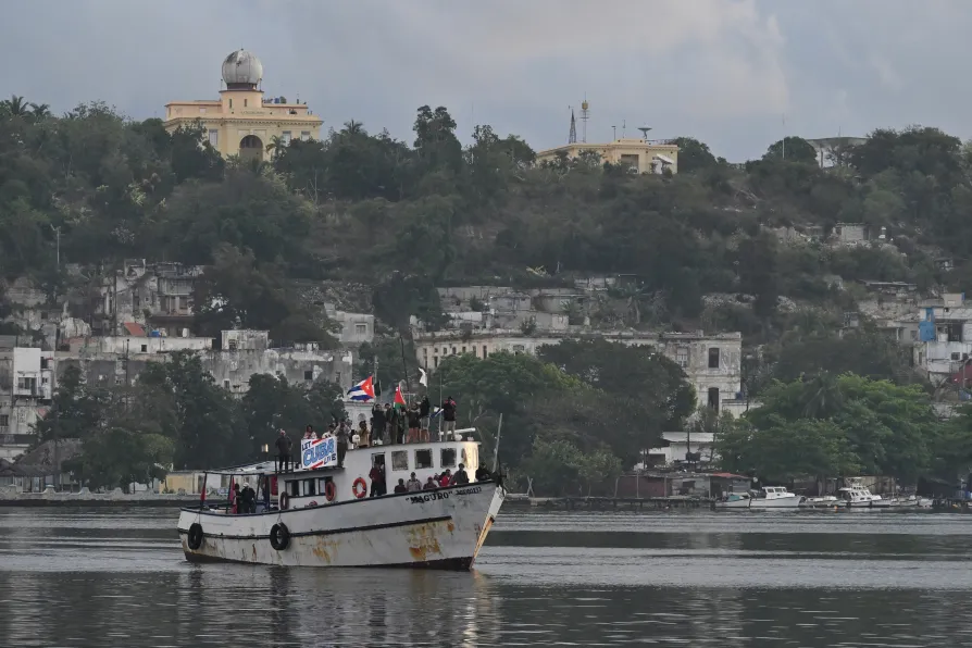 Activists wave Cuban and Palestinian flags from the vessel Maguro, arriving from Mexico with humanitarian aid as part of the "Nuestra America," or Our America convoy, in Havana Bay, Cuba, March 24, 2026