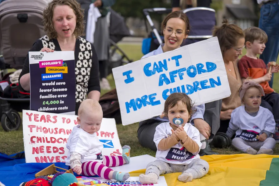 People take part in a "naewhere nursery" protest organised by Pregnant Then Screwed outside the Scottish Parliament in Edinburgh, September 10, 2025