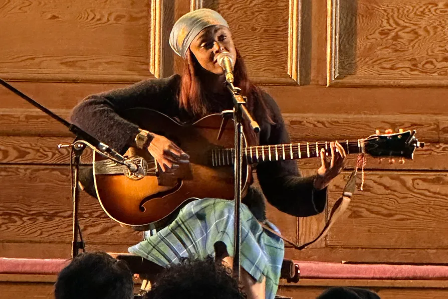 There were further performances throughout the afternoon from Bethany Weimers, Marie Bashiru and Border Widow offering a combination of diverse contemporary and traditional music. But the final two acts in the evening brought together the different themes of the festival and its links with folk music tradition. Cohen Braithwaite-Kilcoyne, an always engaging performer, has recently explored the way British folk songs have travelled over to the Caribbean and adapted accordingly in his album Play Up The Music. His set did include songs from that album but recognising his diverse musical family influences he ended with a rendition of Jimmy Cliff’s, You Can Get It If You Really Want. As a genre originating from the shanty towns reggae can also be considered folk music of the Caribbean.