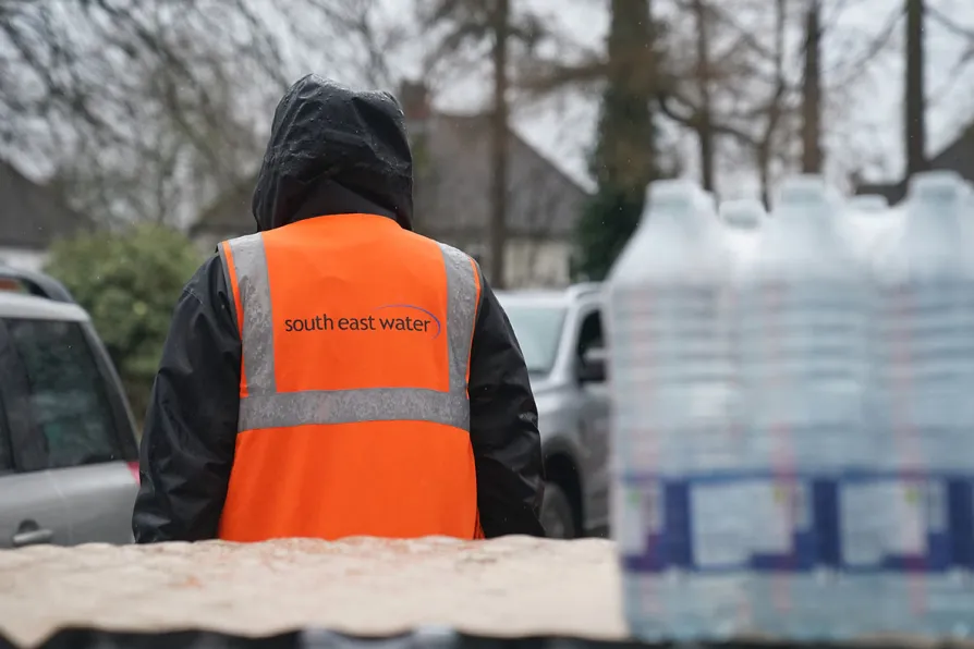 South East Water staff hand out bottled water at a water station in Maidstone, January 13, 2026