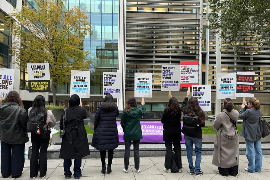 Campaigners gather outside the Home Office in London, calling for an end to the government’s immigration policies that endanger migrant women and entrench racial injustice, October 15, 2025