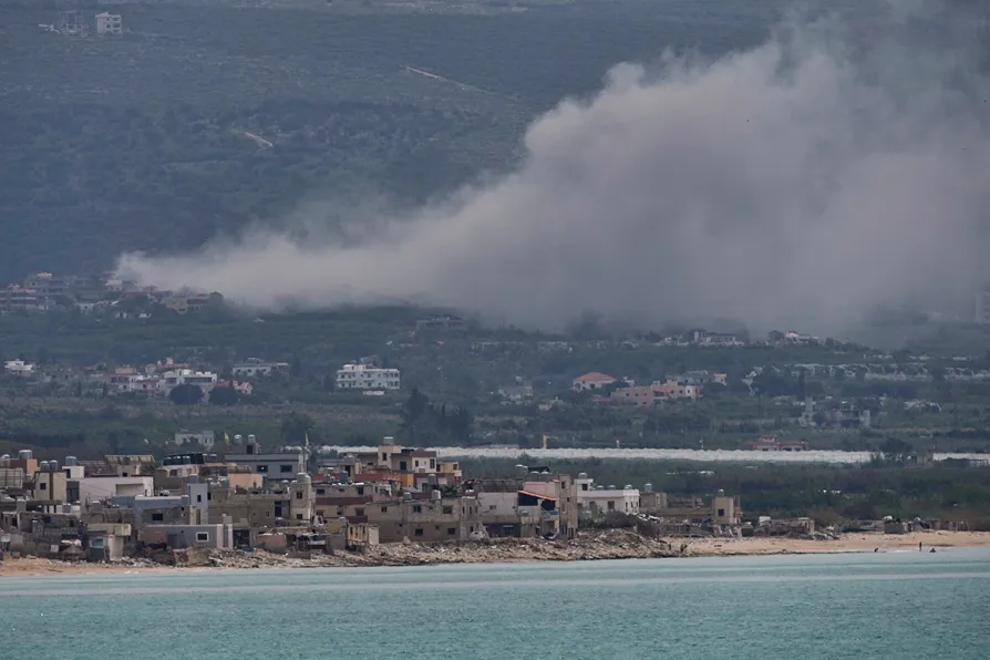 Smoke rises following an Israeli air strike on the village of Henniyeh, as it is seen from the southern port city of Tyre, Lebanon, April 15, 2026