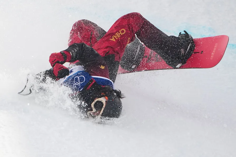 The board slammed flat onto the transition part of the pipe, but quickly caught an edge as it approached the flat part, slamming Liu violently forward while her legs and board snapped over her back — a wreck known in snowboarding parlance as a “Scorpion.”