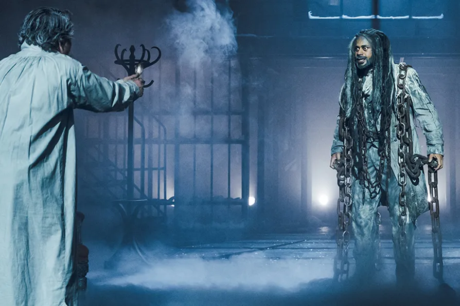 Moving the action to the industrial heartland of the north, the family show doesn’t shy away from emotional highs and lows. Central to this is the depiction of Reece Dinsdale’s Ebenezer Scrooge, now a late Victorian mill owner. Teetering on the edge of pantomime villain, he clearly relishes his humbuggery; terrorising charity workers who ask for donations for the poor and attributing the apparition of deceased business partner Jacob Marley (Obioma Ugoala) to “an undigested piece of meat.”