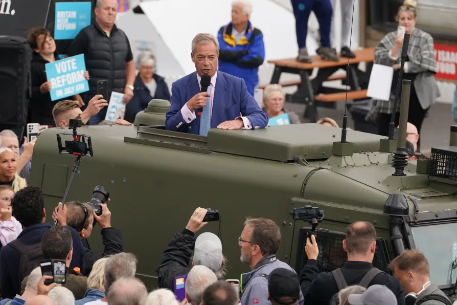 Reform UK leader Nigel Farage gives a speech to supporters on Clacton Pier in Essex, while on the General Election campaign trail, July 3, 2024