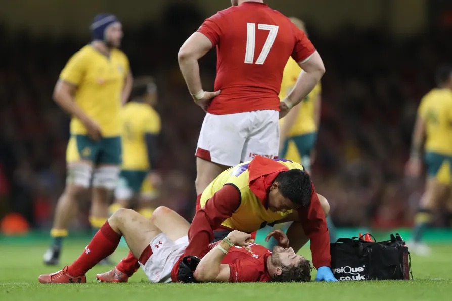 Leigh Halfpenny receives treatment during the Autumn International match against Australia