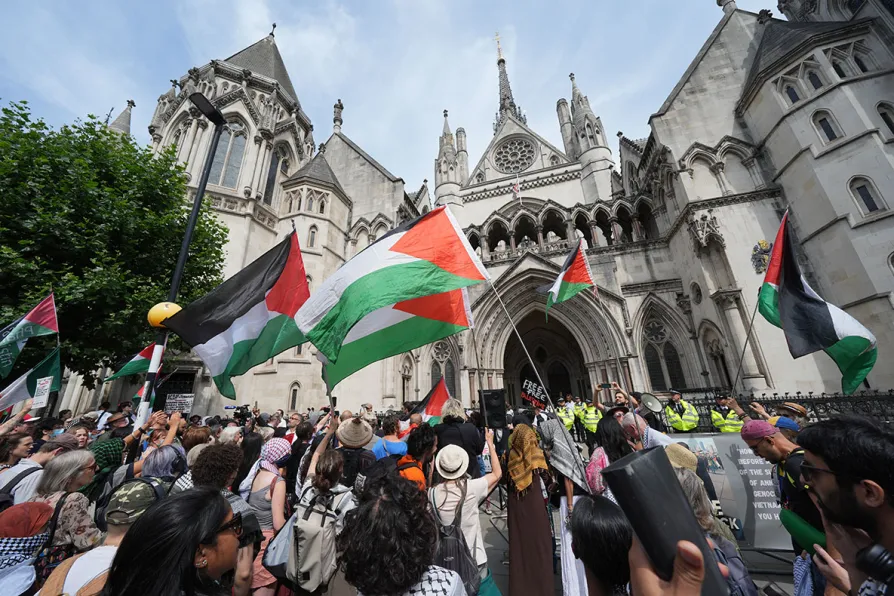 Protesters outside the Royal Courts of Justice on The Strand, central London, ahead of a hearing over whether proscribing of Palestine Action should be temporarily blocked, July 4, 2025