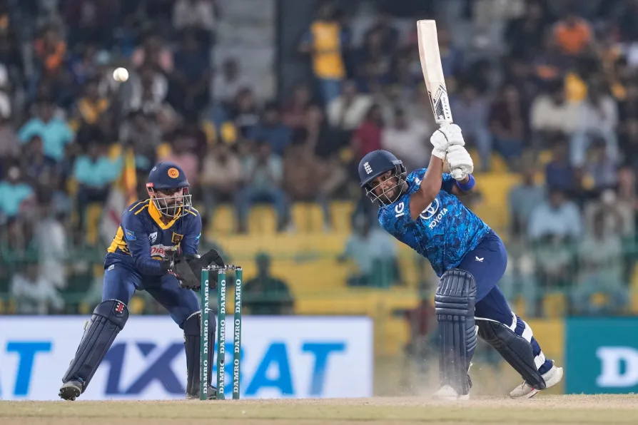 England's Rehan Ahmed plays a shot as Sri Lanka's Kusal Mendis watches during the first ODI cricket match between England and Sri Lanka in Colombo, Sri Lanka, January 22, 2026