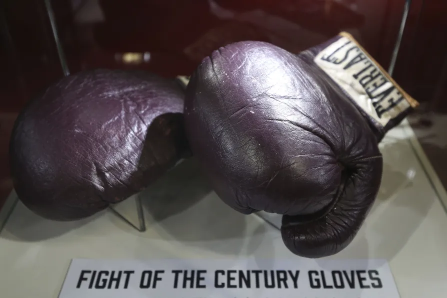 Boxing gloves worn by Muhammad Ali in his fight with Joe Frazier in 1971 billed as the fight of the century, on show ahead of the I Am The Greatest: Muhammad Ali at The O2 exhibition, London, March 3, 2016