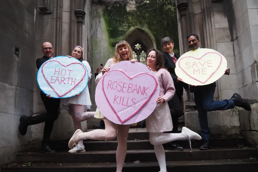 Campaigners in couples stood in St Dunstan’s in the East church grounds on Thursday wearing suits and frilly dresses, holding love heart placards reading: “Save Me,” “Hot Earth” and “Stop Rosebank.”