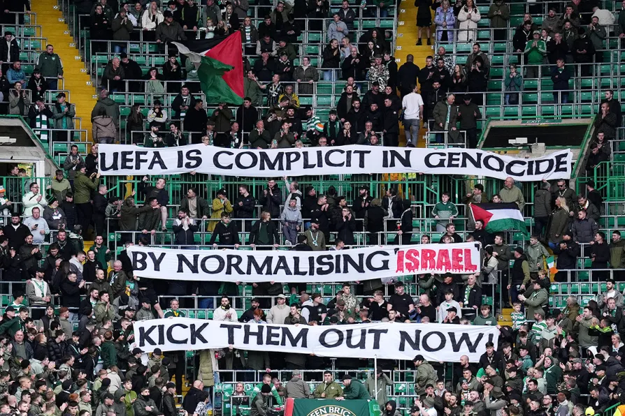 Celtic fans unveil an anti-Israel banner in the stands during the Europa League match at Celtic Park, Glasgow, October 2, 2025