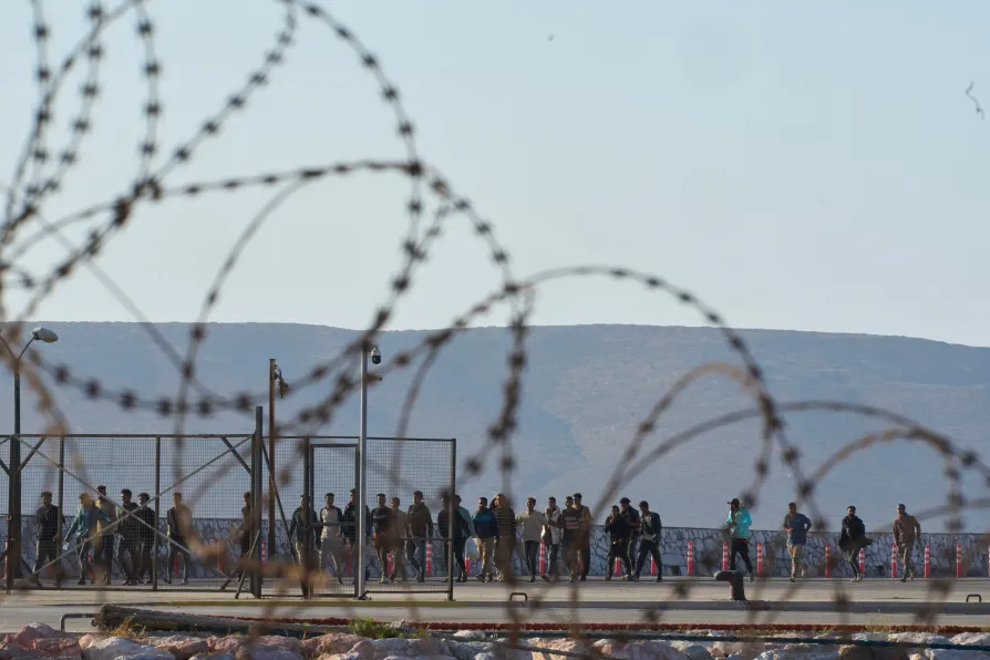 Migrants rescued south of Crete walk after their arrival at the the port of Lavrio, Greece, on July 10, 2025