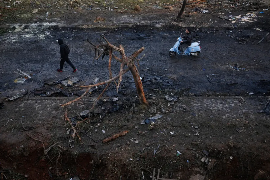 A man rides a scooter past a burned tree and charred debris following an Israeli strike in Beirut, Lebanon, April 1, 2026