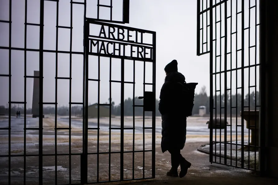A women enters the Nazi concentration camp Sachsenhausen through gate with the phrase: "Arbeit macht frei", Work makes free, on the eve on the International Holocaust Memorial Day in Oranienburg, Germany, January 26, 2026