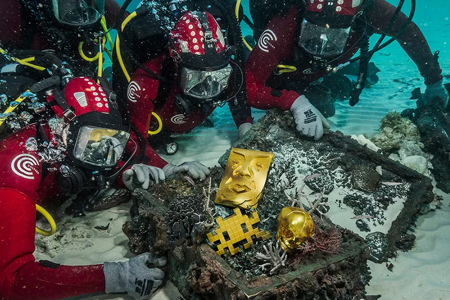 Gallery Five places the emphasis on Hirst’s Treasures From The Wreck Of The Unbelievable series and including Three Divers Discovering Gold, 2025, a statue in painted resin and plaster of three deep sea divers working on a seabed having discovered gold.