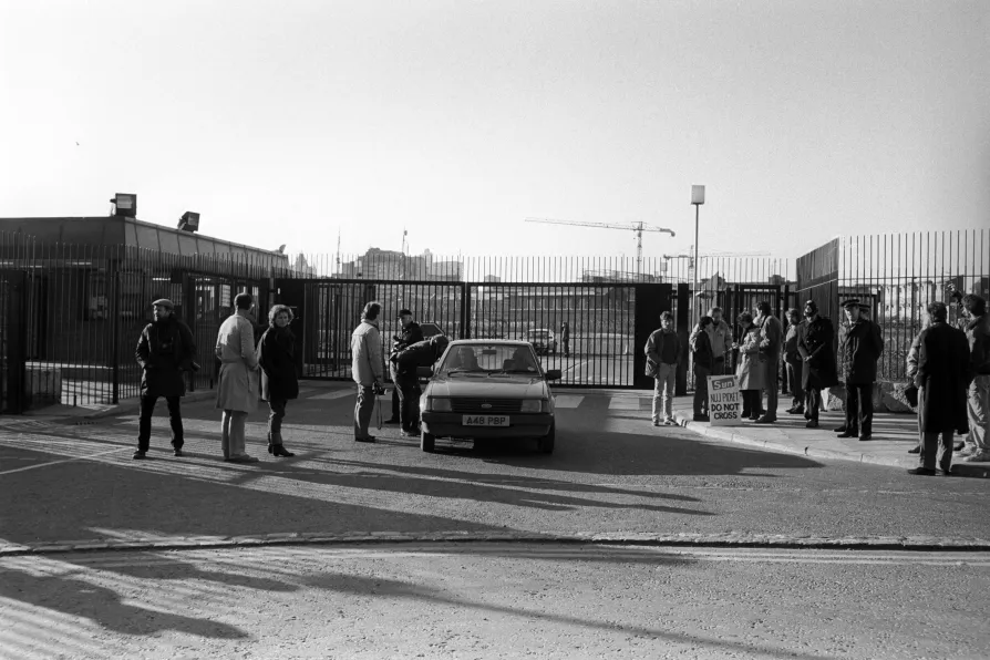 Protesters outside the main gate of Rupert Murdoch's News International plant at Wapping, East London, January 25, 1986