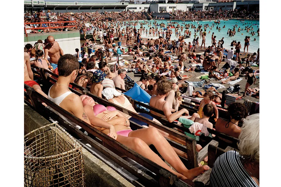 From the New Brighton series, one image shows a packed lido foregrounded by a rusting wire litter basket. In another, a causeway near the beach has a baby crying in its stroller, while its mother lies indifferently sunbathing on the concrete, surrounded by scattered shoes and clothing, a crisp wrapper and a discarded biscuit among other carelessly cast-off items. Yet another shows a mother changing her baby, while sitting on a concrete walkway alongside a stretch of debris-polluted water.