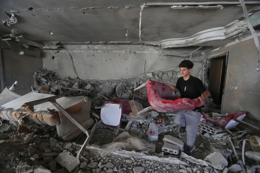 A boy carries a mattress from a destroyed apartment that was hit in an Israeli airstrike on Monday evening in Nabatiyeh town, south Lebanon, September 16, 2025