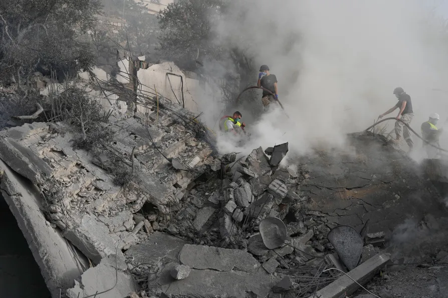 Firefighters extinguish a fire at a destroyed building that was hit by an Israeli airstrike in Ain Qana village, south Lebanon, February 2, 2026