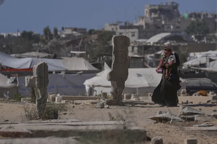 A displaced Palestinian woman carries a child as she walks past makeshift tents set up in a cemetery in Khan Younis, in the southern Gaza Strip, September 20, 2025
