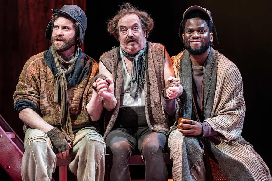 SUFFICIENTLY AMUSING: Ewan Wardrop as Nym, Paul Hunter as Pistol and Emmanuel Olusanya as Bardolph in Henry V [Pic: Johan Persson]