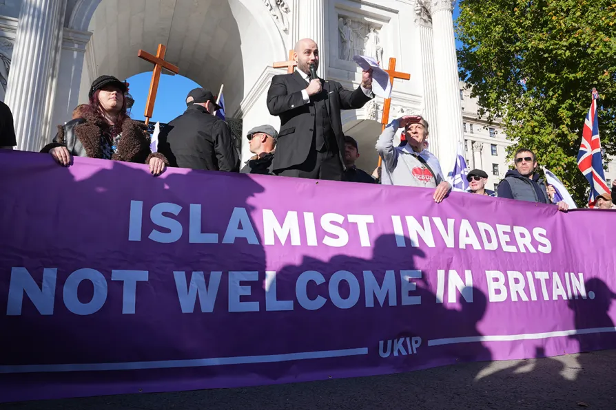 A group of nearly 100 far-right protesters led by Mr Tenconi, holding a banner reading “Islamist invaders not welcome in Britain,” were seen in central London.