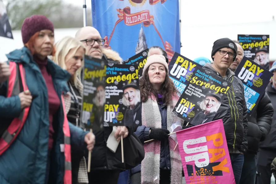 Members of the National Education Union (NEU) hold an 'A Christmas Carol' themed rally outside Rachel Reeves' office in Leeds, December 13, 2024