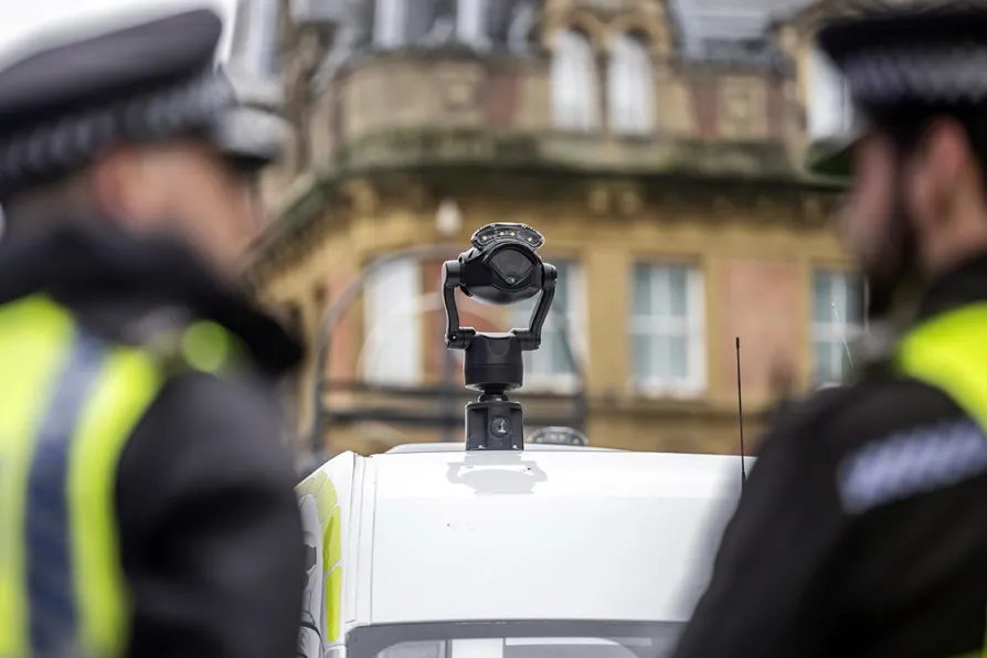 A camera on top of a Live Facial Recognition (LFR) van deployed on Briggate in Leeds, as West Yorkshire Police use the facial recognition technology for the first time in Yorkshire, November 11, 2025