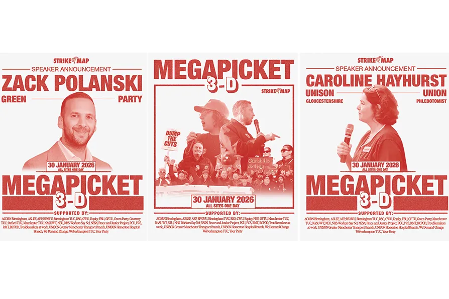 We hope today’s Megapicket will be the biggest yet, and certainly the broadest—bringing together national trade unions, political parties, and, for the first time, politicians from Your Party, the Green Party, and the Labour Party.