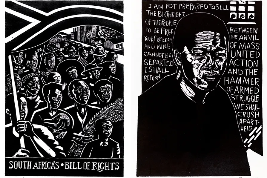 (L) Norman Kaplan, South Africa’s Bill of Rights, 1996; (R) Mandela – Message from Robben Island, 1985 [Pics: © Norman Kaplan/Steve Russell Studios]