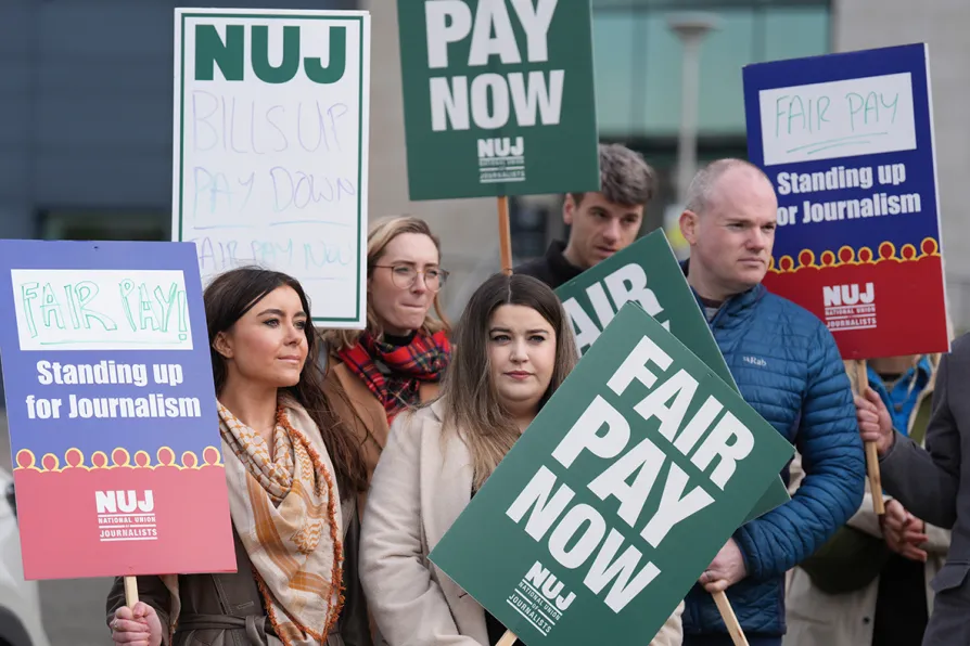 Members of the National Union of Journalists (NUJ) who work at STV take part in a picket outside their studios in Glasgow, after rejecting the company's latest pay offer, May 1, 2024