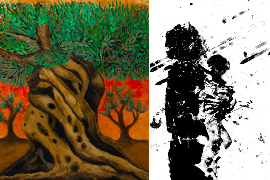 (L) Malak Mattar, If the Olive Trees Knew, 2026; (R) Peter Kennard, Palestine Untitled 33 [Pics: Courtesy of Both Gallery]