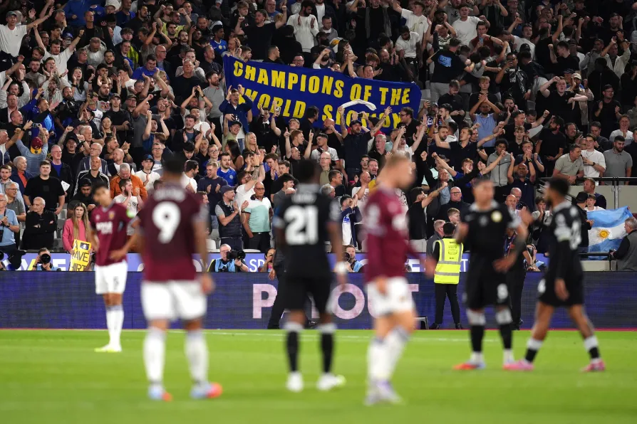 Chelsea fans in the stands celebrate following the Premier League match at London Stadium, London, August 22, 2025