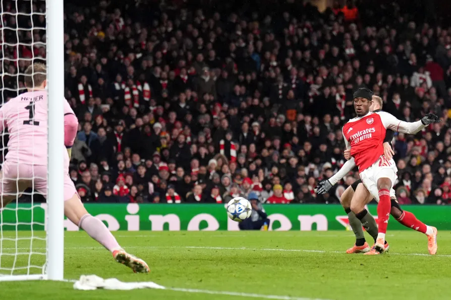 Arsenal's Noni Madueke scores their side's second goal of the game during the UEFA Champions League, league phase match at the Emirates Stadium, London, November 26, 2025