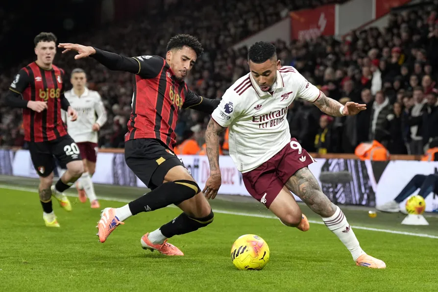 Bournemouth's James Hill (left) and Arsenal's Gabriel Jesus battle for the ball during the Premier League match at the Vitality Stadium, Bournemouth, January 3, 2026