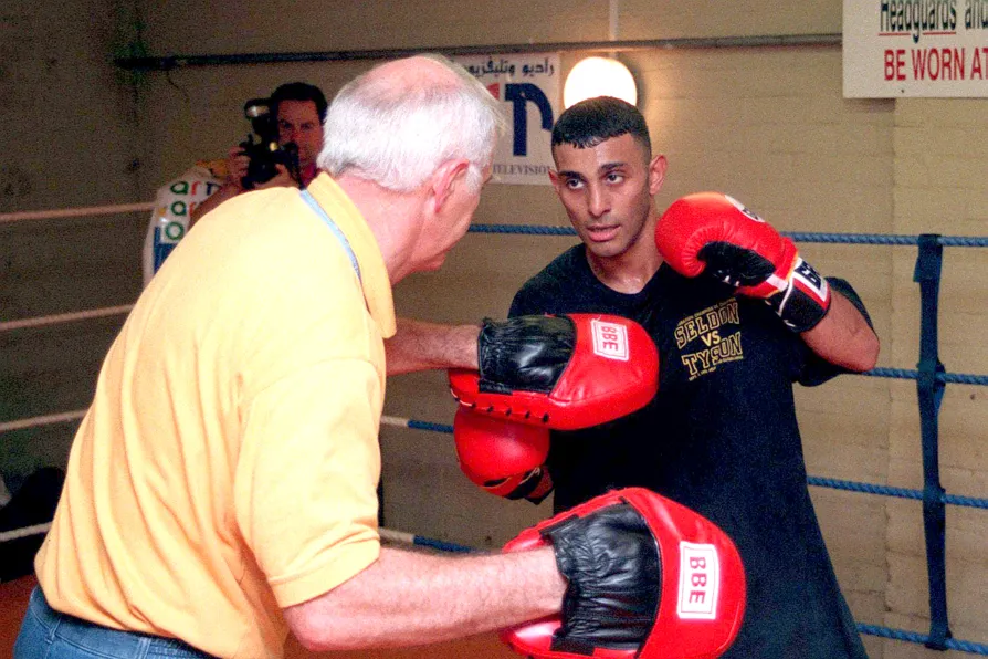 Prince Naseem Hamed with his trainer Brendan Ingle in Sheffield preparing for his WBO featherweight title defense against Jose Badillo, October 8,1997