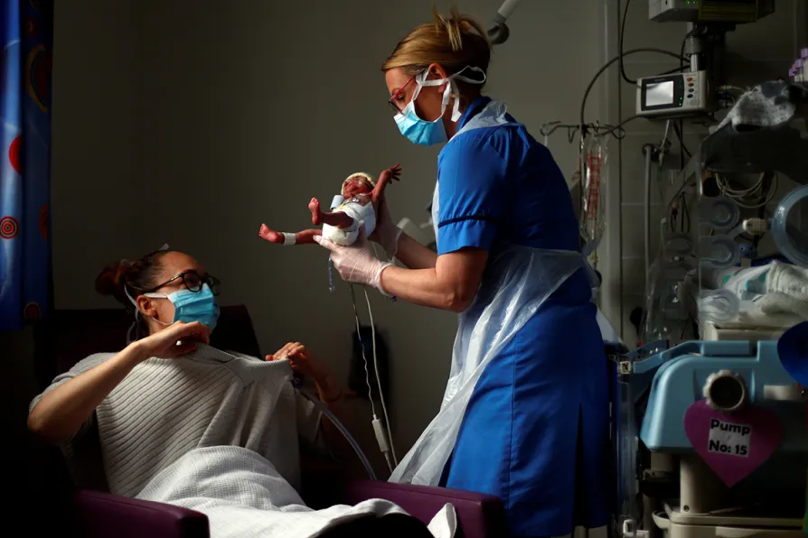 A neonatal nurse carries a premature baby to his mother in the Neonatal Intensive Care Unit at the Lancashire Women and Newborn Centre at Burnley General Hospital, May 2020