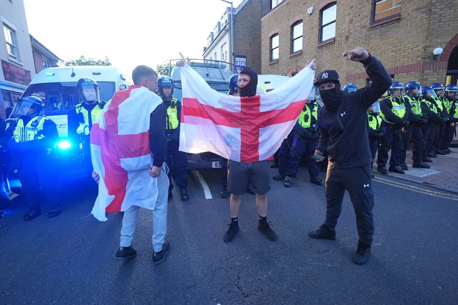 Police officers and far-right goons on Hemnall Street in Epping, after a protest outside the Bell Hotel in Epping, Essex, July 20, 2025