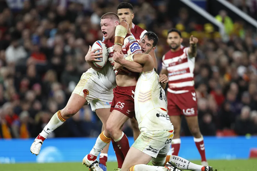 Raring: Wigan Warriors’ Morgan Smithies is brought down by the Catalans Dragons, October 2023