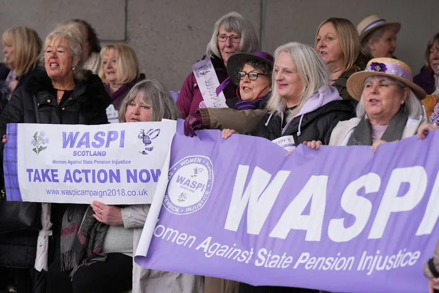 People at a Women Against State Pension Inequality (WASPI) protest outside the Scottish Parliament in Edinburgh, campaigning for justice and full compensation, April 18, 2024