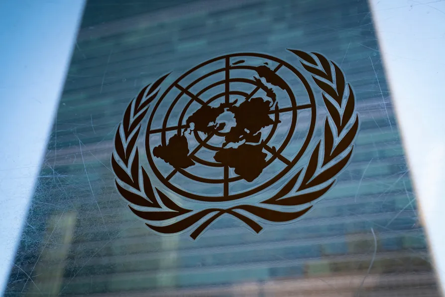 The symbol of the United Nations outside the Secretariat Building in New York, February 28, 2022