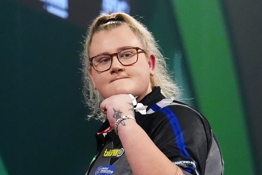 Beau Greaves celebrates winning the second set during her match against Daryl Gurney on day nine of the World Darts Championship at the Alexandra Palace, London, December 19, 2025