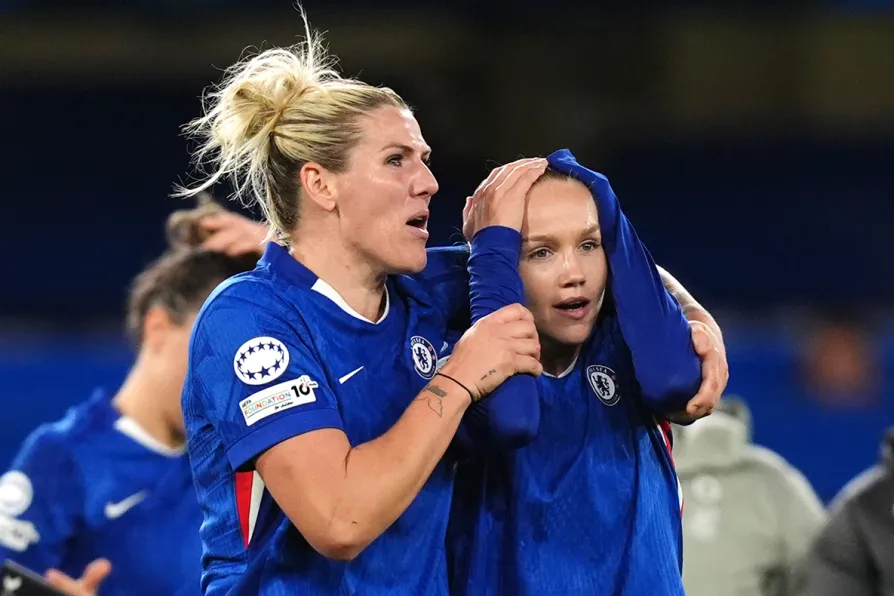 Chelsea's Millie Bright and Guro Reiten react following the Women's Champions League match at Stamford Bridge, London, October 15, 2025
