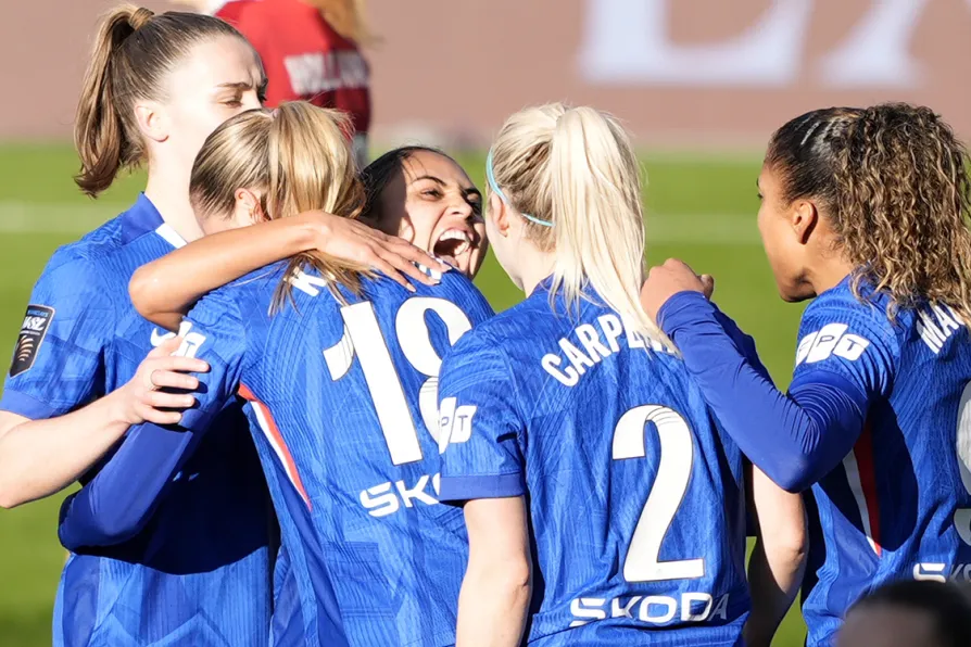 Chelsea's Alyssa Thompson (centre) celebrates scoring their side's first goal of the game with team-mates during the Barclays Women's Super League match at St Helens Stadium, Liverpool, November 16, 2025