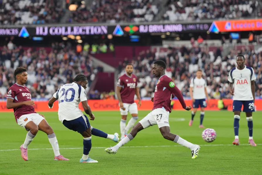 Tottenham Hotspur's Mohammed Kudus (second left) has a shot at goal during the Premier League match at the London Stadium, London, September 13, 2025