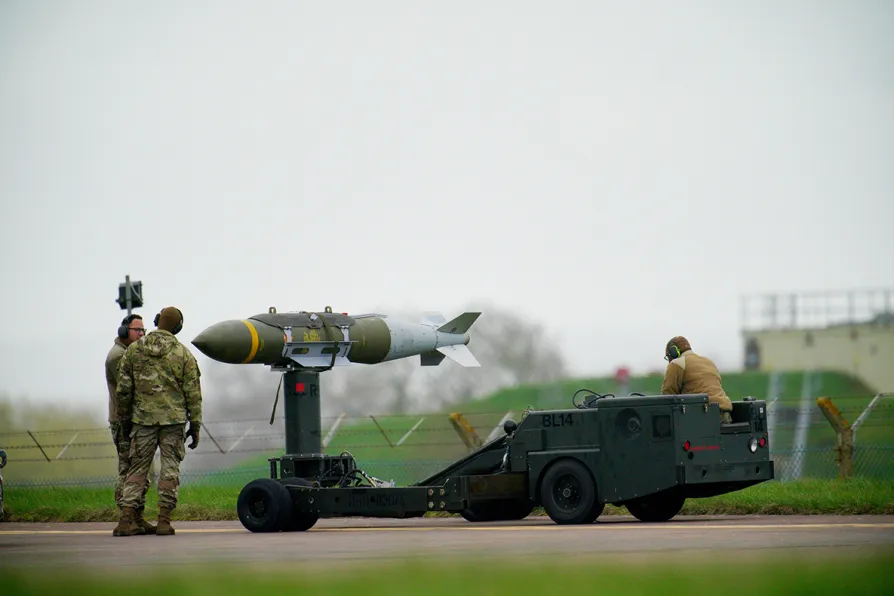 A US Air Force B-1 bomber is loaded with bombs at RAF Fairford in Gloucestershire, March 16, 2026