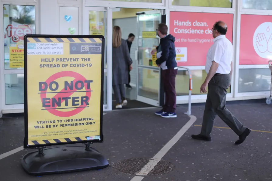 Covid-19 signage at the entrance to Craigavon Area Hospital in Co Armagh, Northern Ireland, May 5, 2020